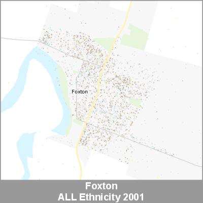 2001 Census Meshblock Data visualised as randomised point data based on the meshblock count of the chosen category, Ethnicity.