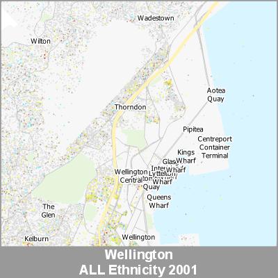 2001 Census Meshblock Data visualised as randomised point data based on the meshblock count of the chosen category, Ethnicity.