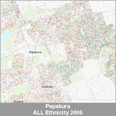 2006 Census Meshblock Data visualised as randomised point data based on the meshblock count of the chosen category, Ethnicity.