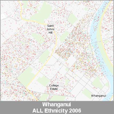 2006 Census Meshblock Data visualised as randomised point data based on the meshblock count of the chosen category, Ethnicity.