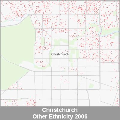 2006 Census Meshblock Data visualised as randomised point data based on the meshblock count of the chosen category, Ethnicity.