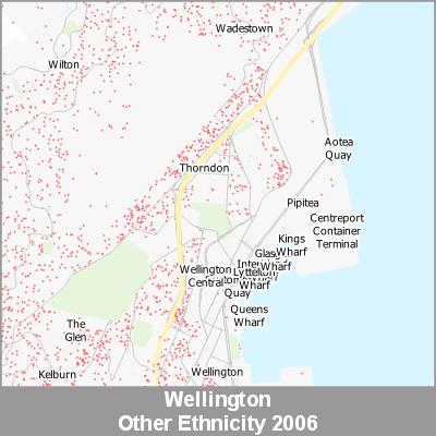2006 Census Meshblock Data visualised as randomised point data based on the meshblock count of the chosen category, Ethnicity.