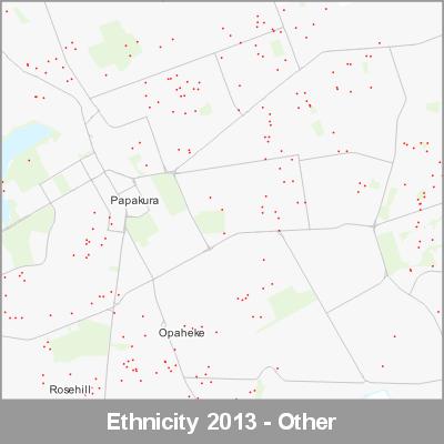 2013 Census Meshblock Data visualised as randomised point data based on the meshblock count of the chosen category, Ethnicity.