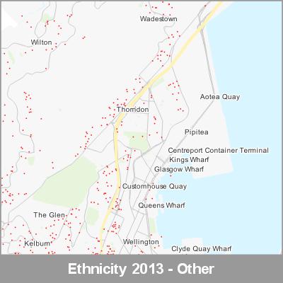 2013 Census Meshblock Data visualised as randomised point data based on the meshblock count of the chosen category, Ethnicity.