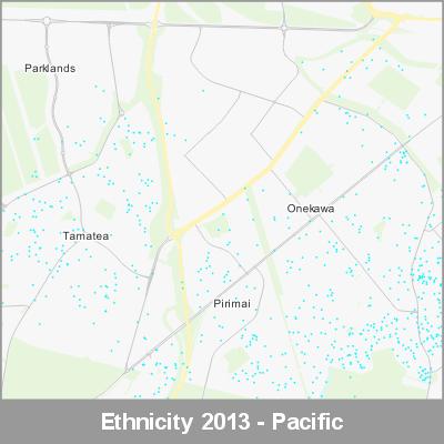 2013 Census Meshblock Data visualised as randomised point data based on the meshblock count of the chosen category, Ethnicity.