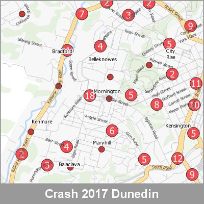 2017 NZTA Crash Analysis System (CAS) showing the location of vehicle crashes visualised as point cluster data based on crash location proximity.