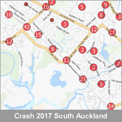 2017 NZTA Crash Analysis System (CAS) showing the location of vehicle crashes visualised as point cluster data based on crash location proximity.