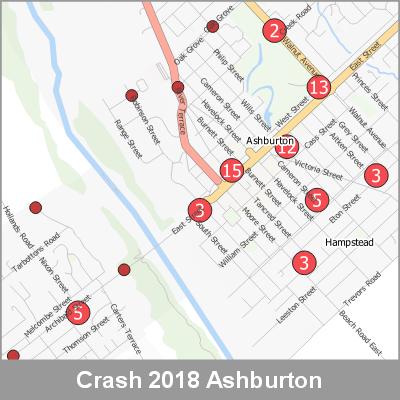 2018 NZTA Crash Analysis System (CAS) showing the location of vehicle crashes visualised as point cluster data based on crash location proximity.