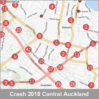 2018 NZTA Crash Analysis System (CAS) showing the location of vehicle crashes visualised as point cluster data based on crash location proximity.