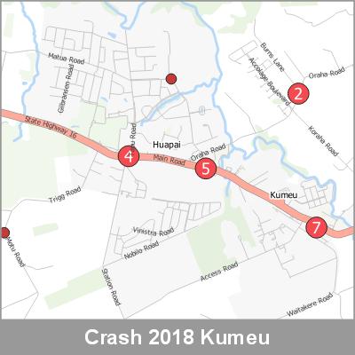 2018 NZTA Crash Analysis System (CAS) showing the location of vehicle crashes visualised as point cluster data based on crash location proximity.