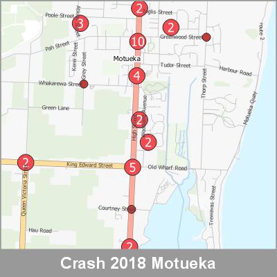 2018 NZTA Crash Analysis System (CAS) showing the location of vehicle crashes visualised as point cluster data based on crash location proximity.