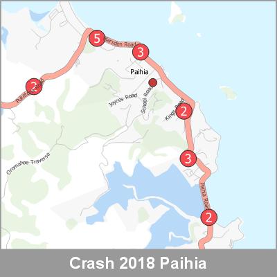 2018 NZTA Crash Analysis System (CAS) showing the location of vehicle crashes visualised as point cluster data based on crash location proximity.