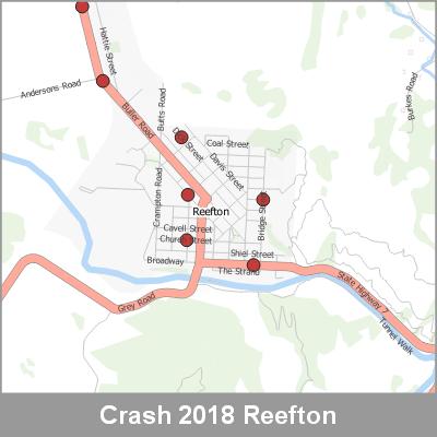 2018 NZTA Crash Analysis System (CAS) showing the location of vehicle crashes visualised as point cluster data based on crash location proximity.