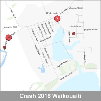 2018 NZTA Crash Analysis System (CAS) showing the location of vehicle crashes visualised as point cluster data based on crash location proximity.