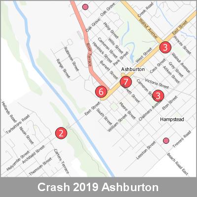 2019 NZTA Crash Analysis System (CAS) showing the location of vehicle crashes visualised as point cluster data based on crash location proximity.