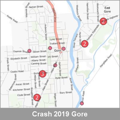 2019 NZTA Crash Analysis System (CAS) showing the location of vehicle crashes visualised as point cluster data based on crash location proximity.