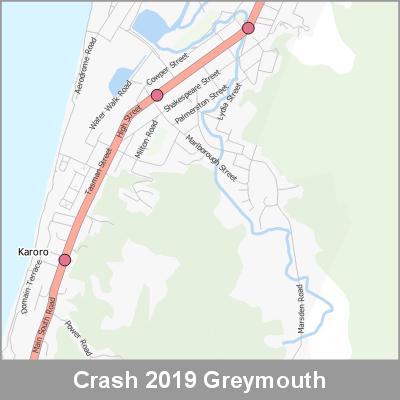 2019 NZTA Crash Analysis System (CAS) showing the location of vehicle crashes visualised as point cluster data based on crash location proximity.