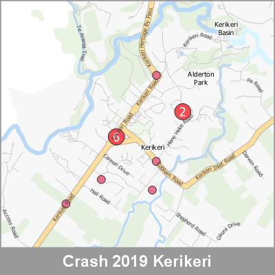 2019 NZTA Crash Analysis System (CAS) showing the location of vehicle crashes visualised as point cluster data based on crash location proximity.