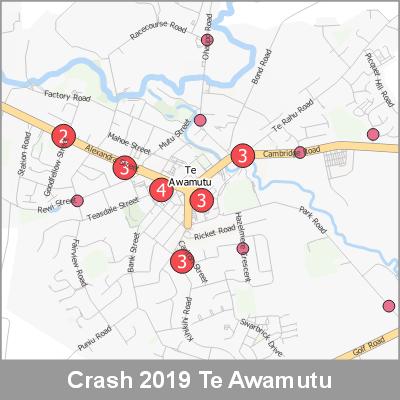 2019 NZTA Crash Analysis System (CAS) showing the location of vehicle crashes visualised as point cluster data based on crash location proximity.