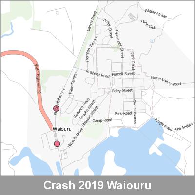 2019 NZTA Crash Analysis System (CAS) showing the location of vehicle crashes visualised as point cluster data based on crash location proximity.