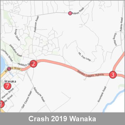 2019 NZTA Crash Analysis System (CAS) showing the location of vehicle crashes visualised as point cluster data based on crash location proximity.