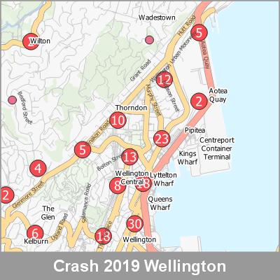 2019 NZTA Crash Analysis System (CAS) showing the location of vehicle crashes visualised as point cluster data based on crash location proximity.