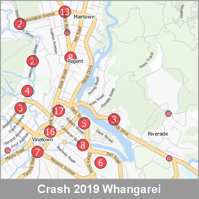 2019 NZTA Crash Analysis System (CAS) showing the location of vehicle crashes visualised as point cluster data based on crash location proximity.